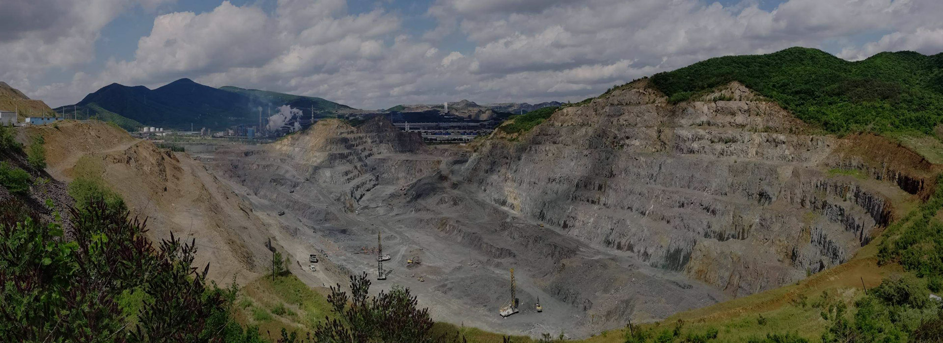 礦料自四周高處開采出來,經(jīng)裝載機裝載后,由9輛自卸斗重卡運送至南部半山腰的的卸貨等待區(qū)